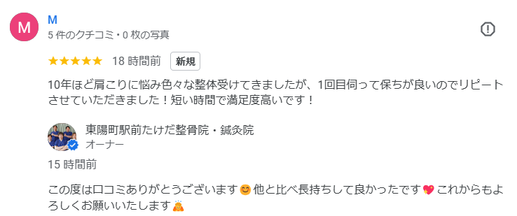 10年ほど肩こりに悩み色々な整体受けてきましたが、1回目伺って保ちが良いのでリピートさせていただきました!短い時間で満足度高いです!