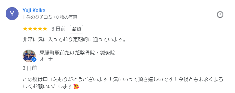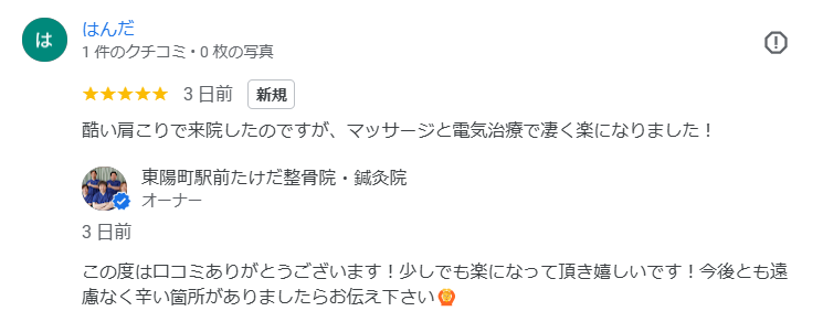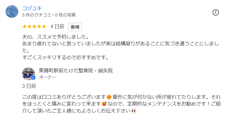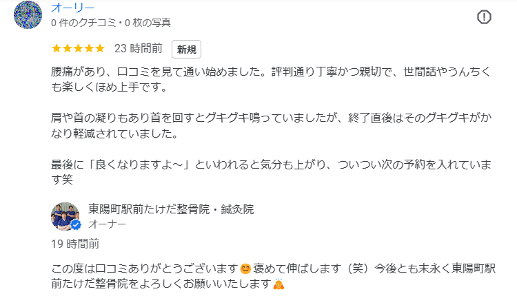 腰痛があり、口コミを見て通い始めました。評判通り丁寧かつ親切で、世間話やうんちくも楽しくほめ上手です。肩や首の凝りもあり首を回すとグキグキ鳴っていましたが、終了直後はそのグキグキがかなり軽減されていました。最後に「良くなりますよ〜」といわれると気分も上がり、ついつい次の予約を入れています笑