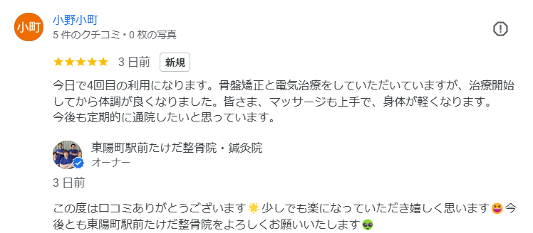 今日で4回目の利用になります。骨盤矯正と電気治療をしていただいていますが、治療開始してから体調が良くなりました。皆さま、マッサージも上手で、身体が軽くなります。今後も定期的に通院したいと思っています。